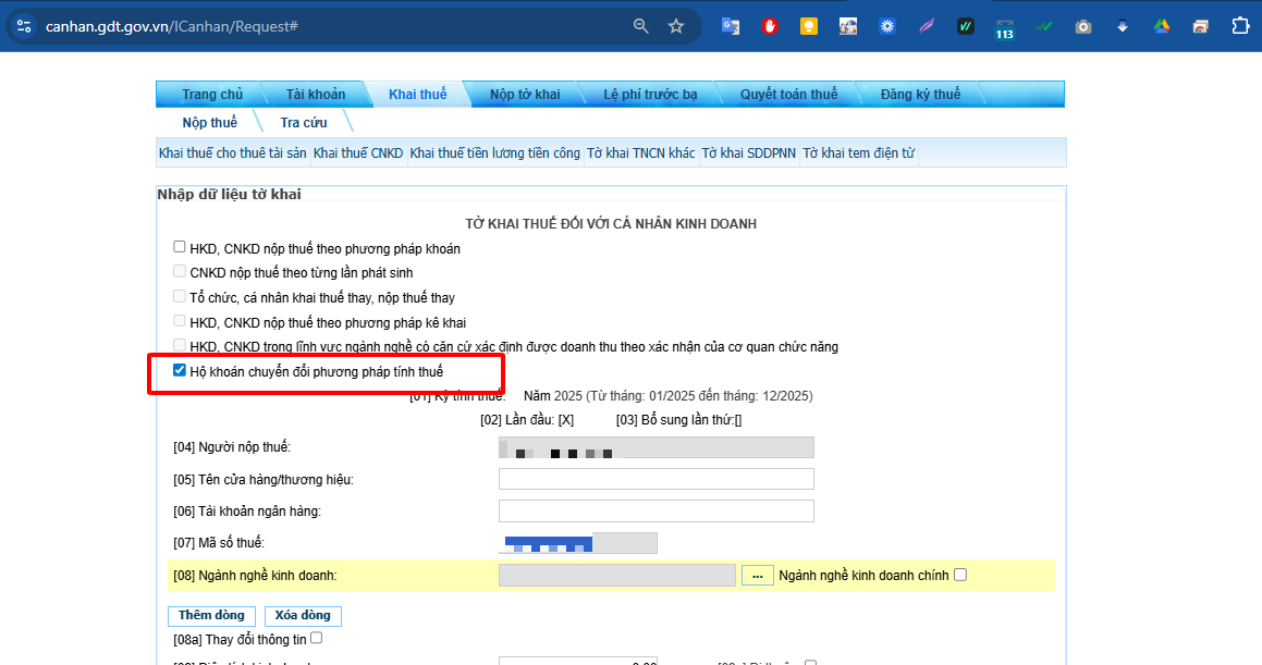 Tích chọn “Hộ khoán chuyển đổi phương pháp tính thuế”