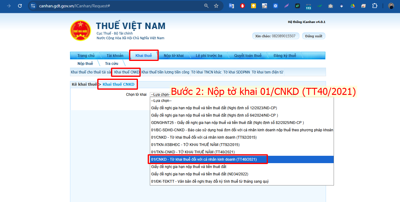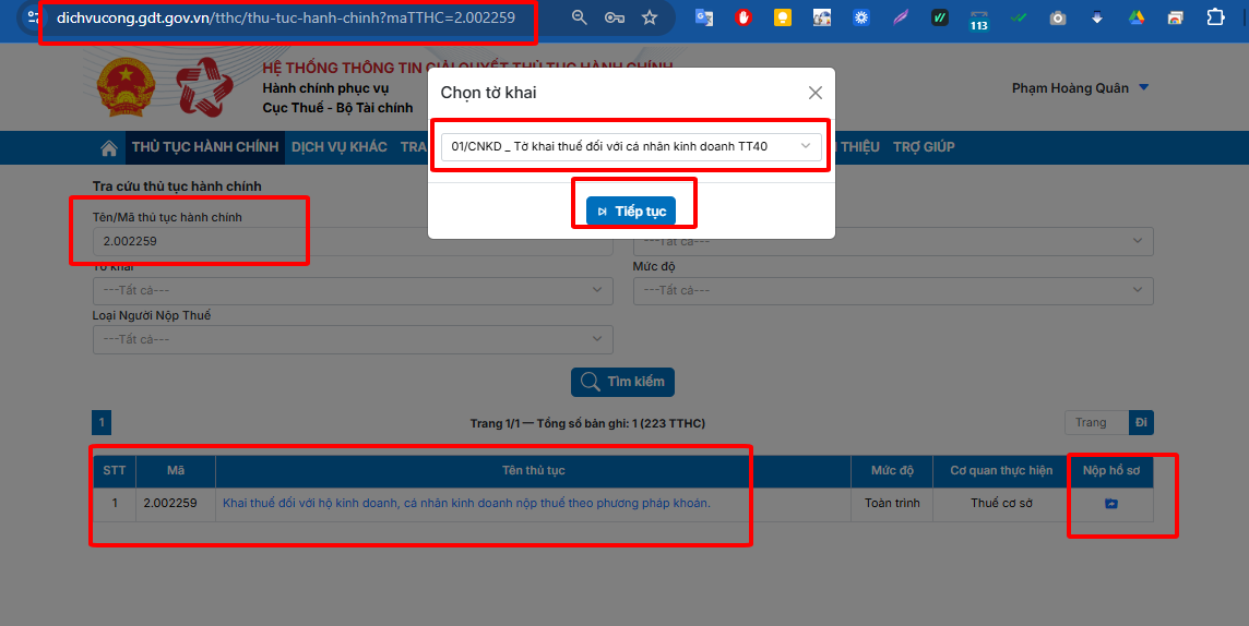 chọn thủ tục mã 2.002259 (mẫu 01/CNKD theo thông tư 40/2021/TT-BTC)
