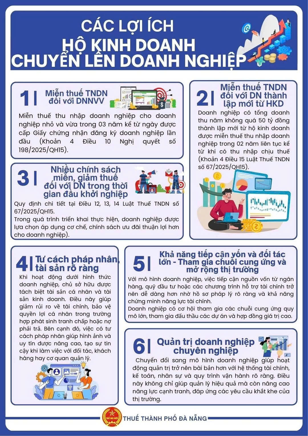 Ngoài ra, doanh nghiệp được thành lập mới từ hộ kinh doanh có doanh thu không quá 50 tỷ đồng/năm còn được miễn thuế TNDN trong 02 năm liên tục kể từ khi có thu nhập chịu thuế (Khoản 4 Điều 15 Luật Thuế TNDN số 67/2025/QH15). Đây là ưu đãi rất quan trọng, giúp doanh nghiệp có thêm nguồn lực tài chính để ổn định và tái đầu tư trong giai đoạn khởi đầu.