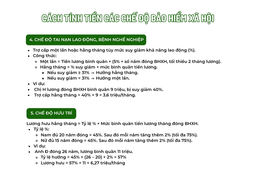 Theo Luật BHXH 2024, có 5 chế độ cơ bản được chi trả gồm: ốm đau, thai sản, tai nạn lao động – bệnh nghề nghiệp, hưu trí và tử tuất. Mỗi chế độ đều có công thức tính cụ thể, minh bạch, giúp người tham gia dễ dàng nắm bắt và chủ động bảo vệ quyền lợi của mình.