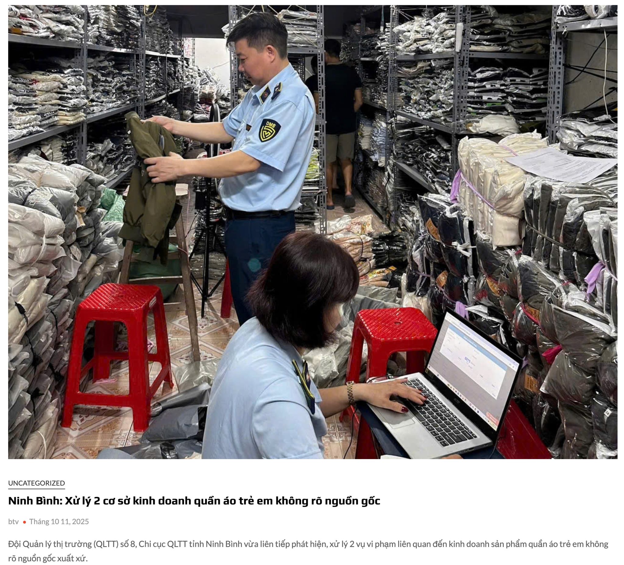 Tương tự, trước đó, ngày 7/10/2025, Đội Quản lý thị trường số 8 cũng xử phạt hộ kinh doanh T.V.M tại phường Đông A, Ninh Bình, vì bày bán hơn 300 sản phẩm quần áo trẻ em không rõ nguồn gốc, không có hóa đơn, với mức phạt 6 triệu đồng và tịch thu hàng hóa vi phạm.
