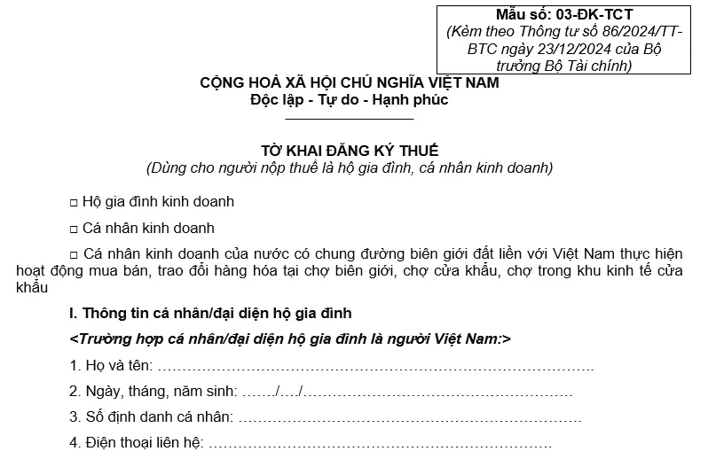 Từ ngày 06/02/2025 mẫu tờ khai đăng ký thuế cho hộ gia đình, cá nhân kinh doanh sẽ áp dụng theo mẫu mới ban hành kèm theo thông tư TT86/2024/TT-BTC.