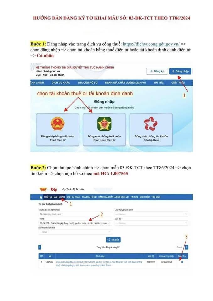 Bước 2: Chọn thủ tục hành chính -> Chọn mẫu 03-ĐK-TCT theo TT86/2024 -> Chọn tìm kiếm -> Chọn nộp hồ sơ theo mã HC: 1.007565