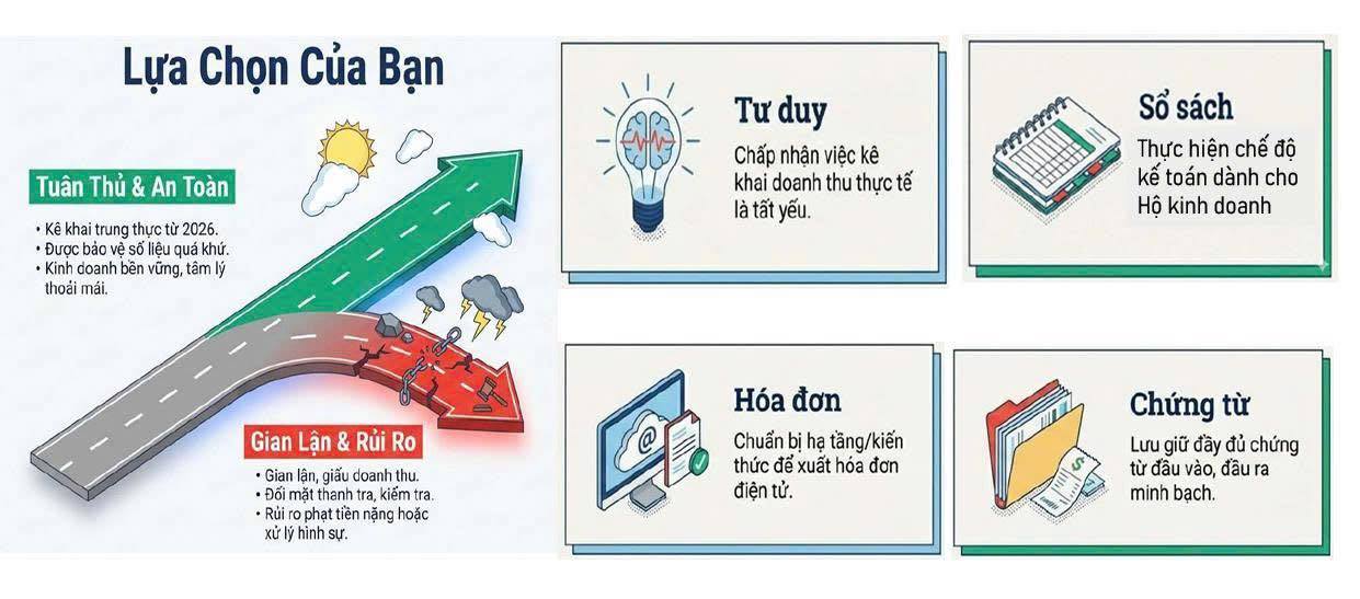 Hộ kinh doanh nên lựa chọn tuân thủ kê khai doanh thu trung thực từ năm 2026. Thực hiện đầy đủ sổ sách, chế độ kế toán dành cho hộ kinh doanh. Với hộ có doanh thu từ trên 1 tỷ nên đăng ký hoá đơn điện tử. Lưu đầy đủ chứng từ hoá đơn đầu vào đầu ra.