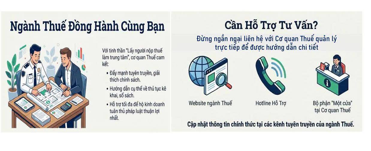 Cơ quan Thuế hướng dẫn cụ thể về sổ sách, thủ tục kê khai. Hỗ trợ tối đa hộ kinh doanh tuân thủ pháp luật thuận lợi nhất. Nếu có thắc mắc hộ kinh doanh liên hệ trực tiếp với cơ quan để được hỗ trợ.