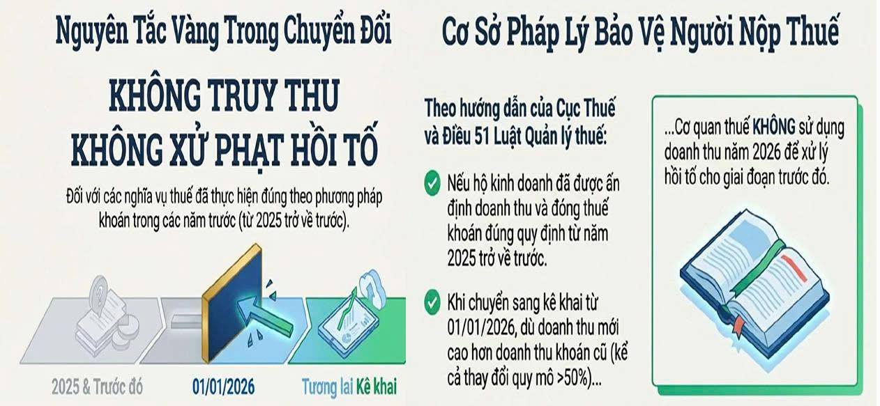 Đối với hộ kinh doanh đã được ấn định danh doanh thu và đóng thuế khoán đúng quy định từ năm 2026 trở về trước, khi chuyển sang kê khai dù doanh thu mới cao hơn doanh thu cũ (kể cả thay đổi quy mô >50%). Cơ quan Thuế sẽ không sử dụng doanh thu năm 2026 để xử lý hồi tố cho giai đoạn trước đó.