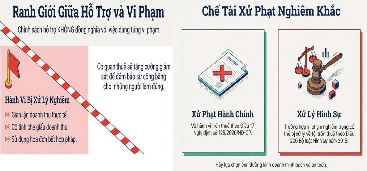 Cơ quan Thuế sẽ tăng cường giám sát để đảm bảo sự công bằng cho những người làm đúng. Và có chế tài xử phạt nghiêm khắc với những người làm sai. Xử phạt hành chính về hành vi trốn thuế theo Điều 17 Nghị định số 125/2020/NĐ-CP. Trường hợp vi phạm nghiêm trọng có thể bị xử lý hình sự về tội trốn thuế theo Điều 200 Bộ luật Hình sự năm 2015.