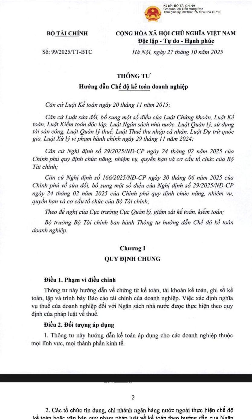 Ngày 27/10/2025, Bộ Tài chính đã chính thức ban hành Thông tư 99/2025/TT-BTC hướng dẫn chế độ kế toán doanh nghiệp mới, có hiệu lực thi hành từ ngày 01/01/2026. Thông tư này áp dụng cho năm tài chính bắt đầu từ hoặc sau ngày 01/01/2026.