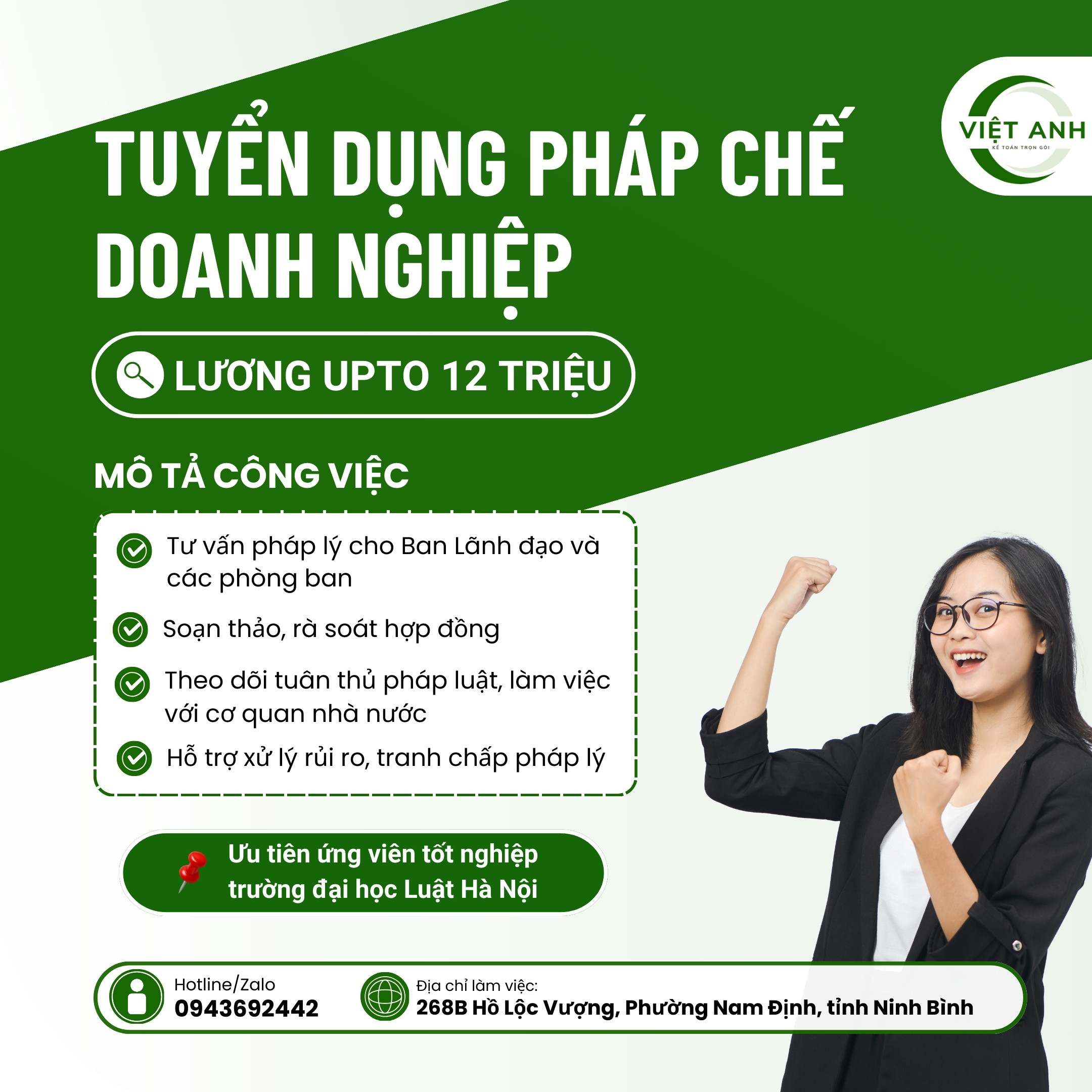 Kế toán Việt Anh cần tuyển chuyên viên pháp chế doanh nghiệp lương thử việc 12 triệu/tháng. Làm việc tại 268B Hồ Lộc Vượng, Phường Nam Định, tỉnh Ninh Bình